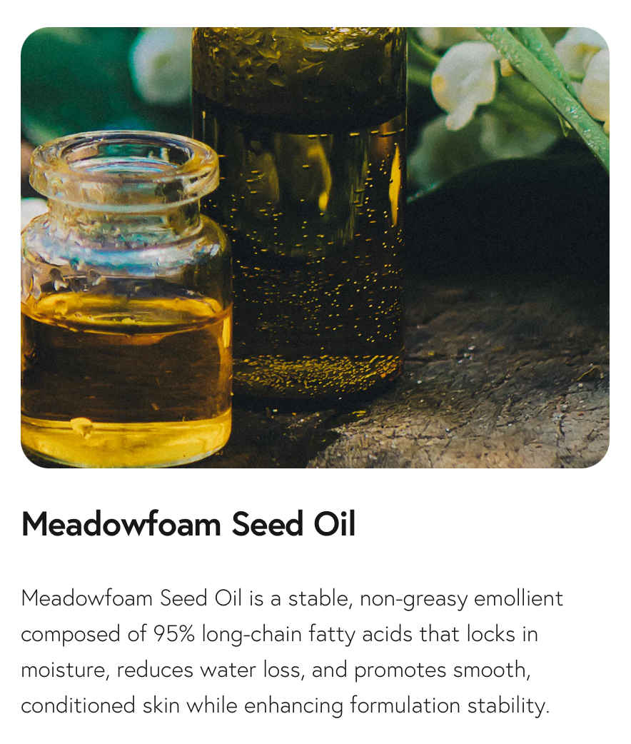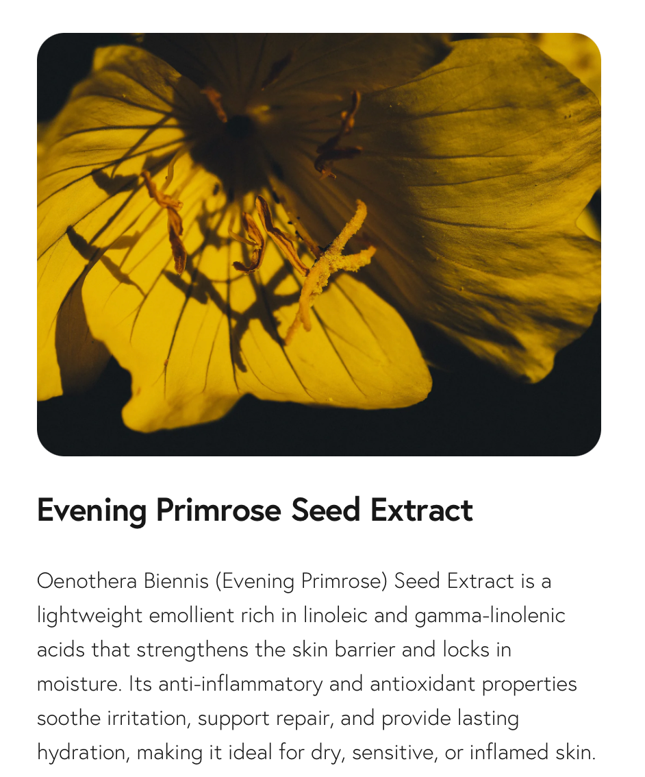 Water, Caprylic/ Capric Triglyceride, Propanediol, Glycerin, Butyrospermum Parkii (Shea) Butter, Pentylene Glycol, Limnanthes Alba Meadowfoam Seed Oil, Glyceryl Stearate SE, Stearyl Alcohol, Steareth-20, Tocopherol, Salvia Hispanica Seed Oil, DSD (Disodium S-Phytyl Diglycoloylcysteine), Spilanthes Acmella Flower Extract, Ceramide NP, Isocetyl Alcohol, Cetyl Alcohol, Phytosterols, Ferulic Acid, Oenothera Biennis (Evening Primrose) Seed Extract, Butylene Glycol, Carbomer, Sodium Phytate, Potassium Hydroxide