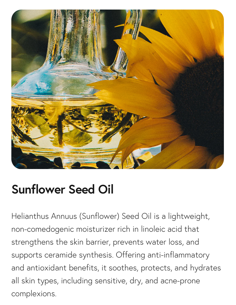 • Sunflower Seed Oil to melt away dirt and makeup