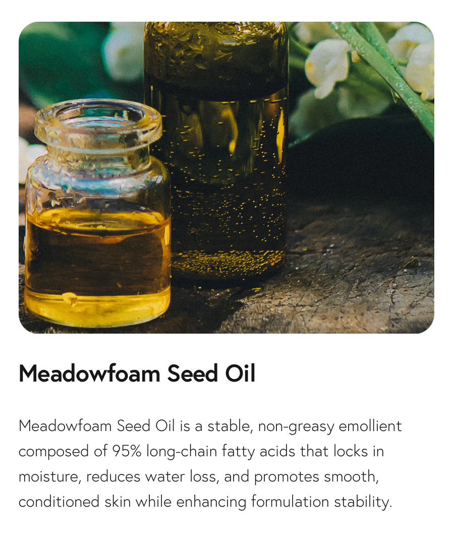 • Meadowfoam Seed Oil to unclog pores and hydrate